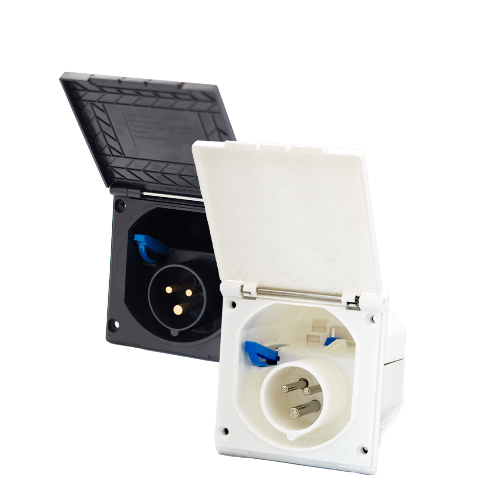 Toma de corriente EE con cierre magnético. Para que la tapa permanezca cerrada incluso al conducir y con viento fuerte. bote de montaje redondo de 120 x 135 mm, Ø 95 mm, con tapa abatible. Joven blanco.